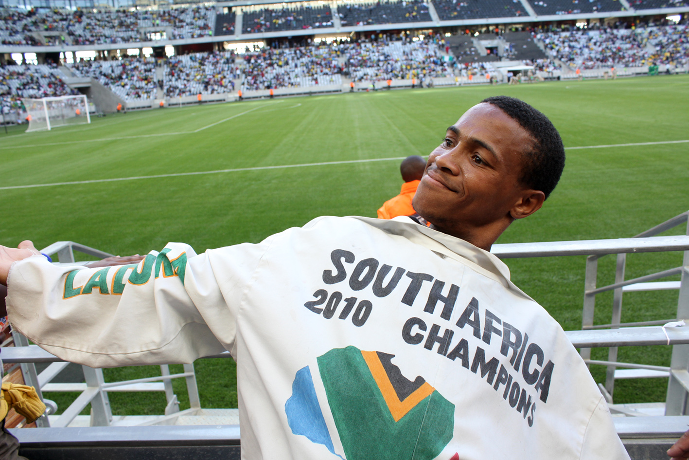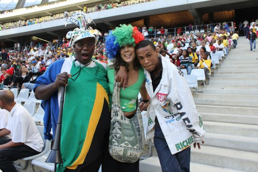 Antes do jogo do Brasil, a seleção da África do Sul jogou com a Nigéria. A festa no estádio era sul-africana. O povo aqui é muito festivo! Cheguei cedo e os sul-africanos fazendo um estardalhaço com as vuvuzelas, celebrando a vitória. E, é claro, onde tem festa, eu vou! Também quero participar!