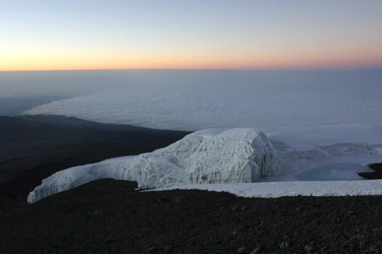 À meia-noite, já quinto dia, inicia-se a caminhada rumo ao cume. A passada é lenta, “pole pole” (que significa “devagar, devagar” na língua swahili) e constante. Não se pode parar por um longo tempo, senão o corpo congela. Apenas pequenos descansos de 1 a 2 minutos. A temperatura gira em torno de 7 graus negativos no sopé do Pico Uhuru. São cerca de 5 a 6 horas caminhando, por uma encosta íngreme, até chegar a Stella Point, início do platô. O ideal é chegar em Stella Point no nascer do sol, entre 5:40 e 6 h, para apreciar o espetáculo da natureza. Mais 40 minutos de caminhada sobre o platô e atinge-se o topo da África!