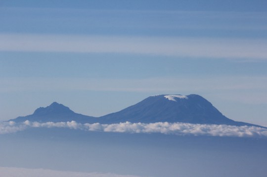 Kilimanjaro despontando no mar de nuvens, ao fundo.