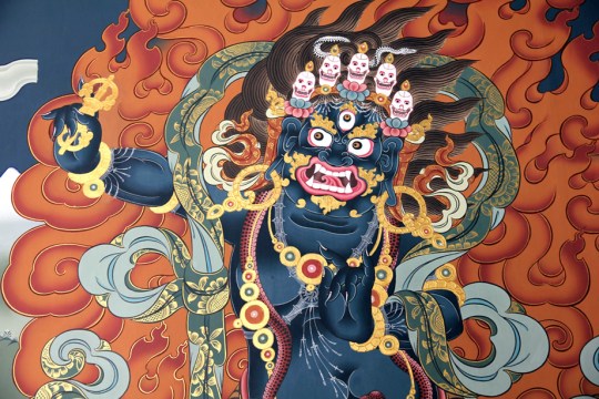 Deus tomado pela ira para afastar os maus espíritos. Dorje, o instrumento em sua mão direita, é uma arma usada para subjugar demônios, maus espíritos. Os 5 crânios em sua cabeça representam a transformação dos 5 venenos (ignorância, ódio, raiva, cobiça, orgulho) em sabedoria e compaixão.