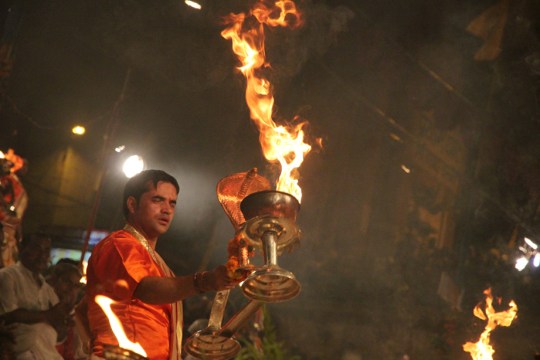 Pujas (preces) e aratis (flor com uma vela num pequeno recipiente) são oferecidos ao rio sagrado.