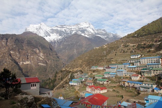 Namche a 3.440 metros de altitude.Partindo de Namche, a jornada é ingreme. Vencida a colina, a trilha plana serpenteia pela encosta de um vale – sem muito esforço, puro deleite. Dia ensolarado, as pernas andavam sozinhas, inebriadas pelo cenário dos sonhos: picos nevados ao longo da trilha emoldurando a paisagem. No trajeto, uma estupa homenageia o Sherpa Tenzing Norgay e todos os sherpas do Everest, os verdadeiros tigres da neve. Com céu limpo, avistamos no fim do vale o pico da montanha. Dormimos na bucólica vila Dole, a 4.110 metros, de ambiente rustic e clima rural. Há poucas pessoas e alojamentos, começamos a entrar na solitude da montanha. Muitos turistas optam pelo percurso via Tengboche, direto ao acampamento base do Everest. Fomos pela trilha via Lagos Gokyo. É mais longa, mas o visual compensa. Na manhã seguinte, caminhada leve de três horas até Maccherma, a 4.470 metros acima do nível do mar. Outro dia prazeroso, com uma subida suave roadeada por montanhas. Os picos de neve eterna nos acompanham o tempo todo, para deleite visual. No quinto dia de caminhada, o corpo dá sinais de fadiga. Em Maccherma, um posto médico presta o primeiro atendimento às pessoas acometidas do “mal de montanha”. Mesmo sem os sintomas, fui até lá para medir o percentual de oxigênio no sangue: 90%. Segundo a voluntária que me atendeu, uma ótima taxa para 4.470 metros de altitude. Senti-me contente e cheia de coragem. O cansaço havia sumido.